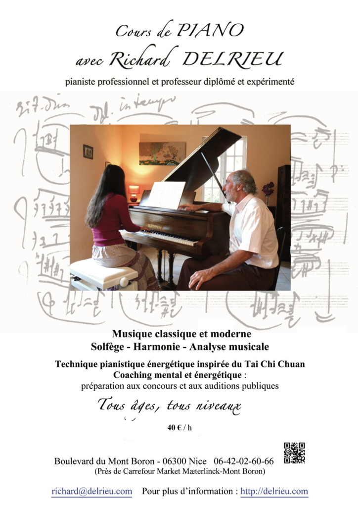 Pianiste professionnel et professeur diplômé et expérimenté, Richard DELRIEU est titulaire d’un 1er Prix de l’ORTF, d’une Licence de Concert, et Maître en Musicologie. Il a passé 20 ans au Japon où il a donné de nombreux concerts en soliste et en musique de chambre, et enseigné dans plusieurs universités japonaises (Kyoto, Kobe, Nagoya). Il pratique le Tai Chi Chuan depuis 25 ans.